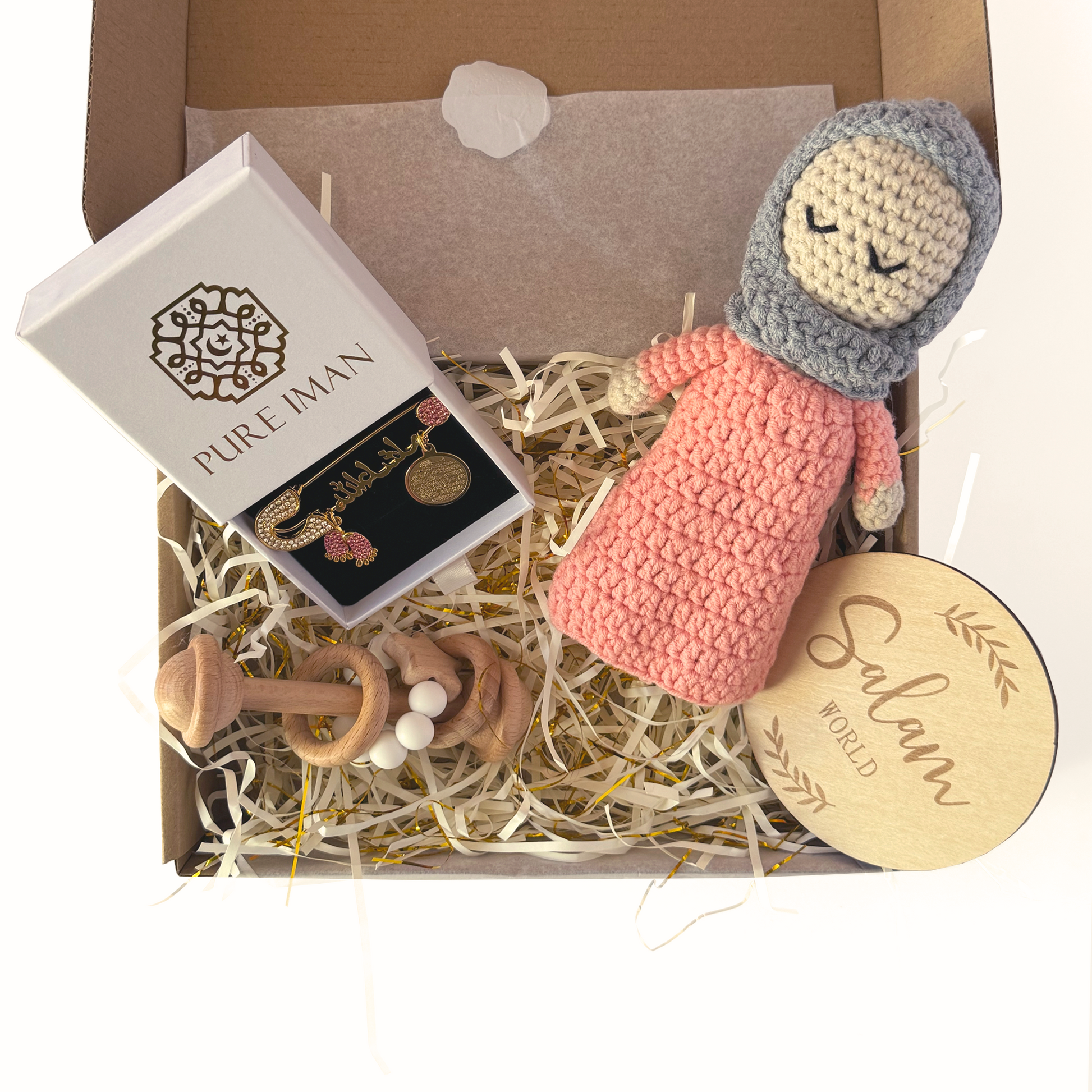 Our Noor Gift Box is a cute Muslim baby gift for any newbown with our pure cotton knitted doll to introduce the little one to Islamic values and their identity early on. This box includes: