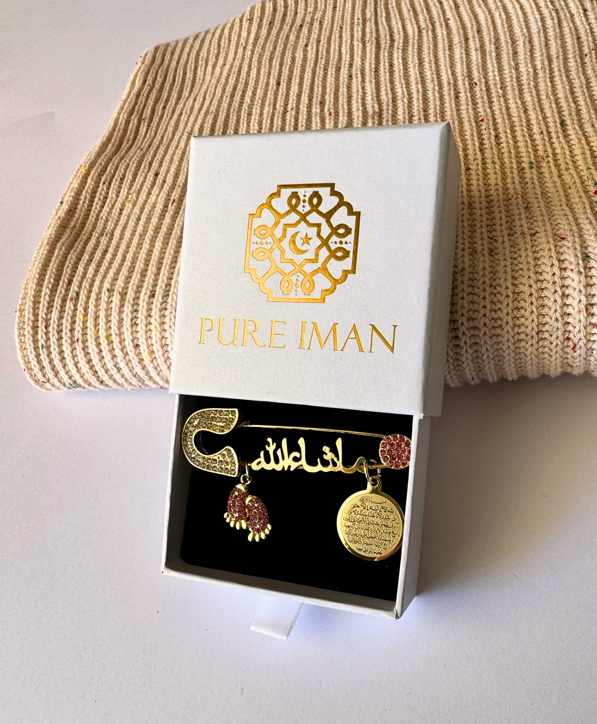 Ayatul Kursi Pin - Our Ma Shaa Allah baby pins include a cute pendant of newborn feet and a gold plated stainless steel Ayatul Kursi pendant to offer protection for the newborn, and invite barakah (blessings) into their lives